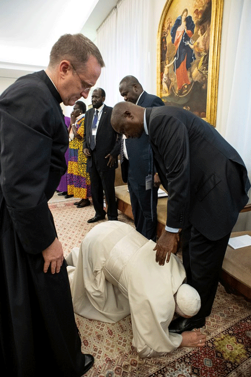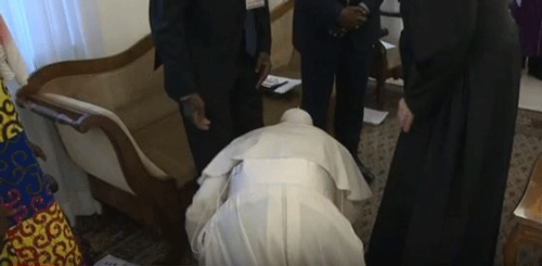 ركع بابا الفاتيكان فرنسيس ليقبل قدمي رئيس جنوب السودان سلفاكير ميارديت وزعيم المعارضة رياك مشار، ودعاهما إلى الحفاظ على السلام في بلادهما وتجنيبها حربا أهلية.