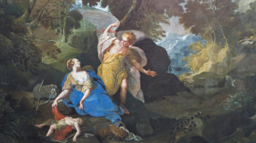 عندها يظهر ملاك الرب لهاجر، وهذا أول ظهور ملائكي لامرأة في الكتاب المقدس، ويطلب منها أن ترجع وتخضع لمولاتها، ثم يباركها بتكثير نسلها وبسبب أن الله قد رأى مذلتها، ثم يعطيها الملاك نبوءة عن ابنها "إسماعيل" أنه سيكون "انسانا وحشيا، يده على كل واحد ويد كل واحد عليه".